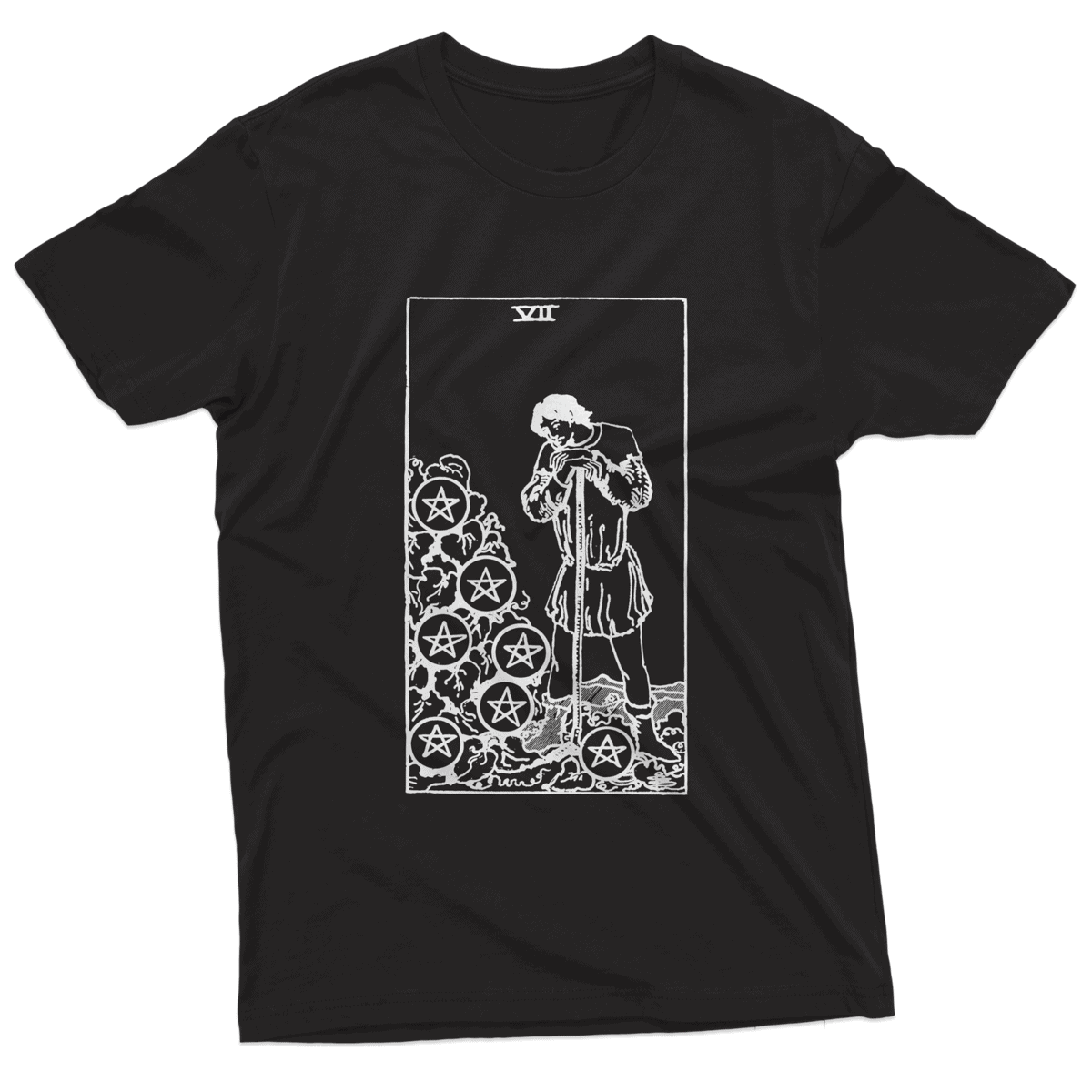 The Seven of Pentacles T-shirt embodies patience, perseverance, and the rewards of diligent effort. Illustrated on the shirt, a figure stands amidst a fruitful garden, carefully tending to the growing plants with a sense of anticipation. This image captures the essence of waiting for one’s efforts to bear fruit and the anticipation of future rewards. This shirt is perfect for individuals who understand the value of hard work and patience in achieving long-term goals. It serves as a reminder that success often requires dedication and persistence, but the rewards are worth the wait.