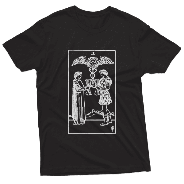 Cozy up with the Two of Cups shirt. This shirt is made from soft fabric and features the Two of Cups card on the front. The Two of Cups card symbolizes harmony and balance, and the shirt is the perfect way to show your love for those things. Whether you’re wearing it to relax at home or to run errands, this shirt will keep you warm and comfortable all day long.